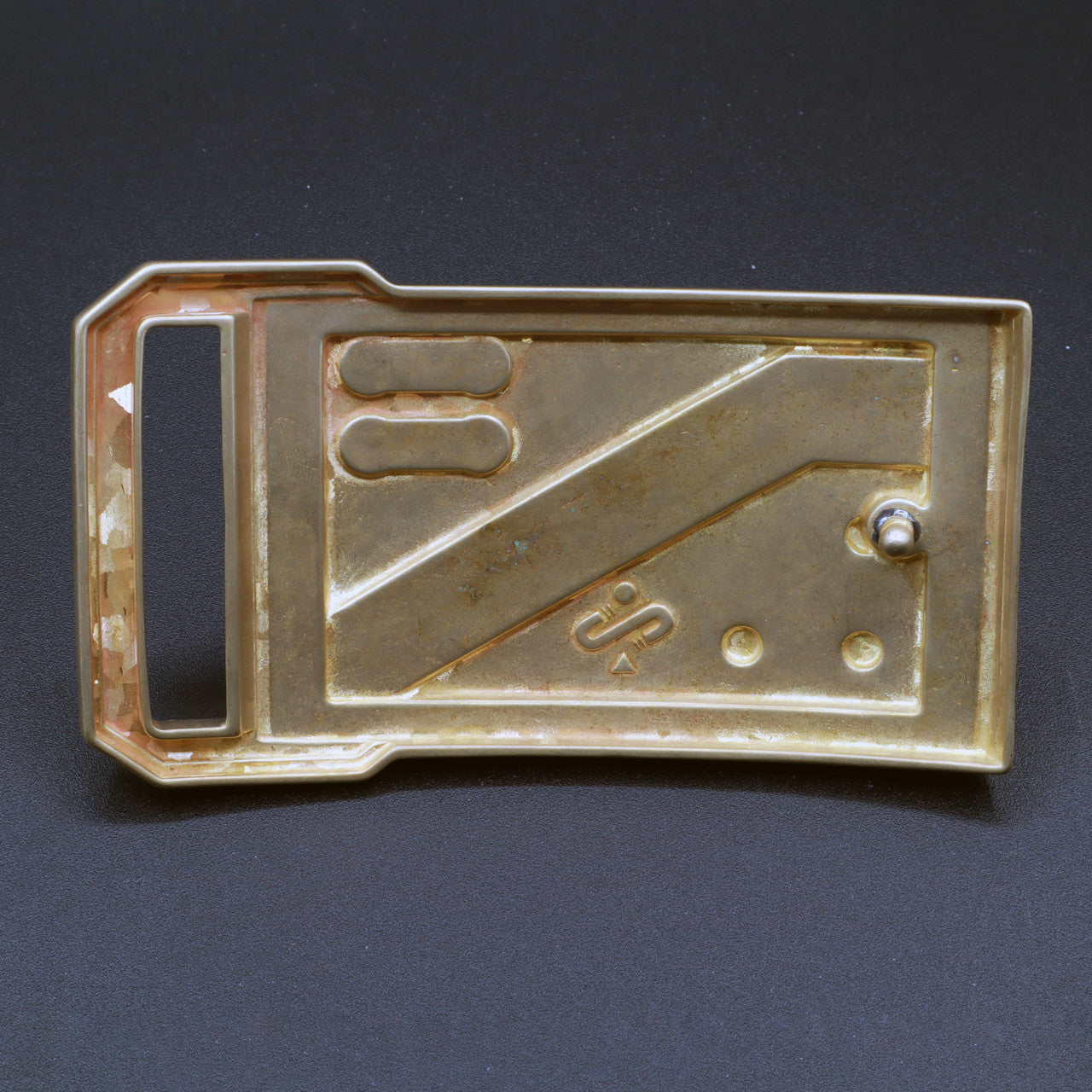 The buckle is made from 100% solid brass, investment cast, with a brass stud braised to the rear. As this is a raw brass product each has its own unique patina on the front, but being raw brass you can clean any areas you do not like the look of with a brass cleaning agent such as Brasso, and weather and paint it to match the original prop.