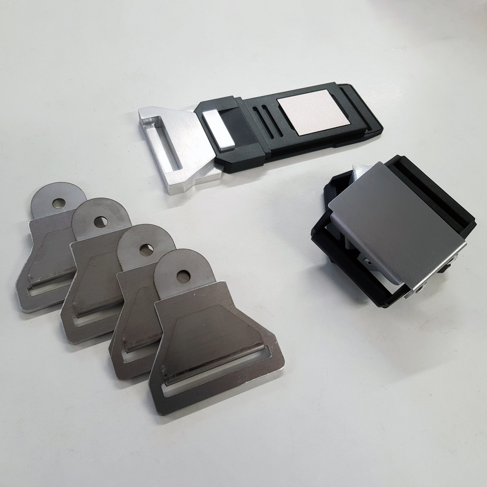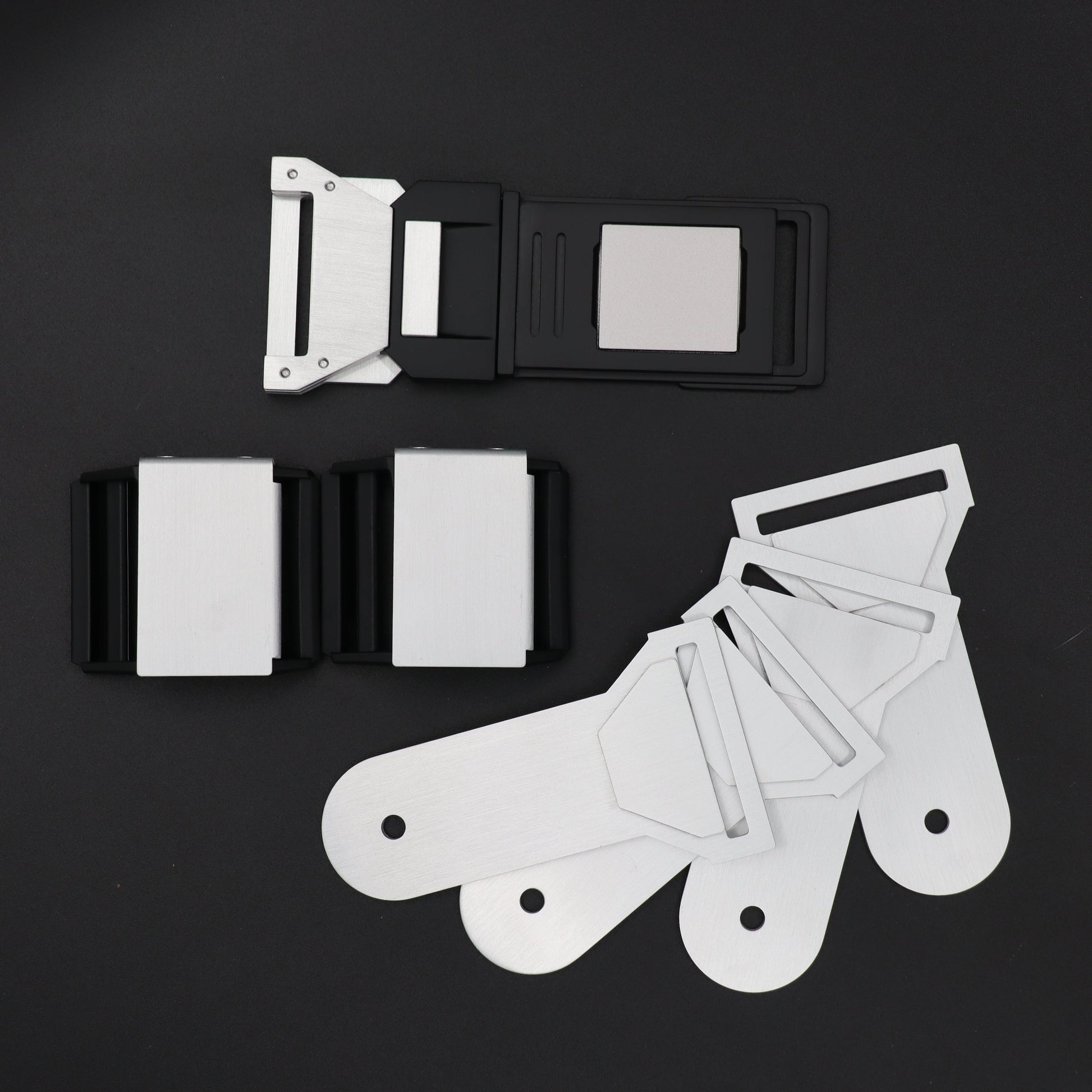The front buckle is the centrepiece of this set. It is a 12-piece assembly consisting of CNC aluminium, vacuum cast rubber and quality fixings, secured with high tensile steel M3 countersunk screws.