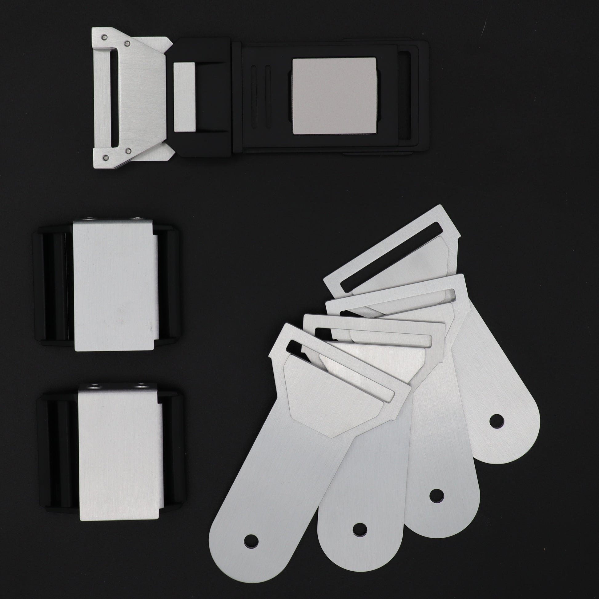The set four (Bo Katan) hip hangers are sized for straps at 44.5mm (1.75in) wide, each buckle has been custom formed from sheet aluminium and stainless steel.