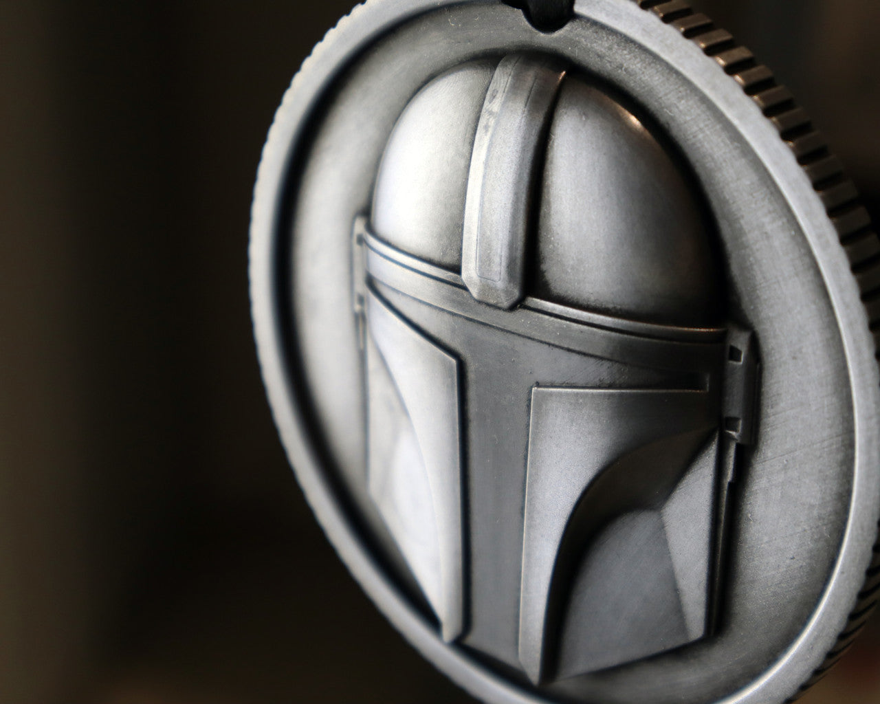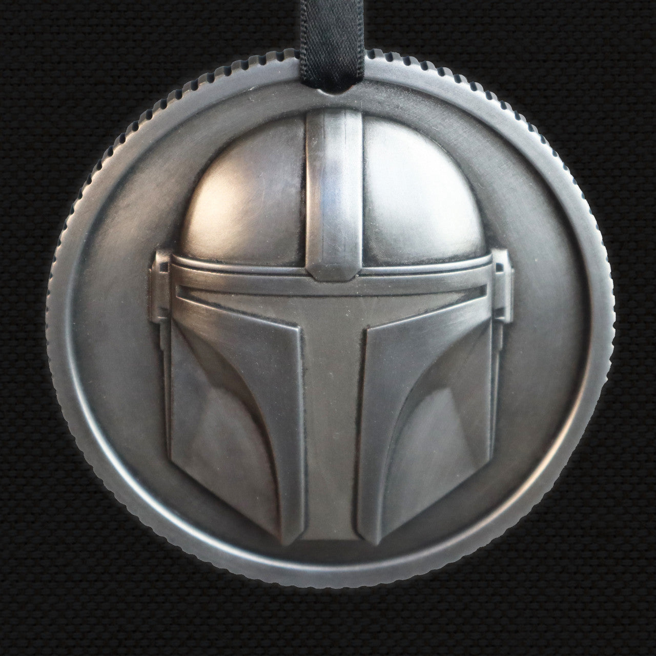Single sided 87mm (3.43") diameter metal effect resin decoration featuring the Mandalorian's iconic helmet design complete with black ribbon for hanging. Hand-cast with love in the JJ Industries foundry.