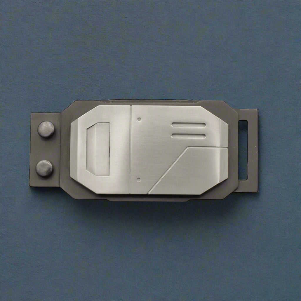 These two hip buckles are fully functional side buckles accurate to the originals seen on screen. They feature a CNC-bent aluminium cover plate riveted securely onto the body of the buckle. They are designed to take a leather strap 1.5" (38mm) wide.