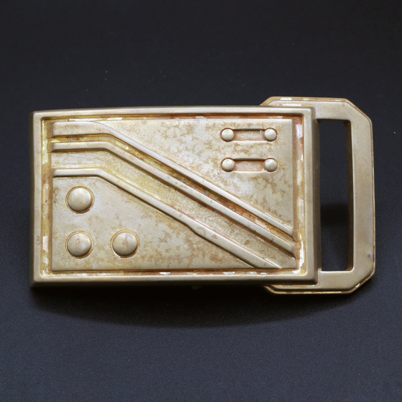 These two hip buckles are fully functional side buckles accurate to the originals seen on screen. They feature a CNC bent brass cover plate riveted securely onto the body of the buckle and are designed to take a leather strap 1.5" wide.